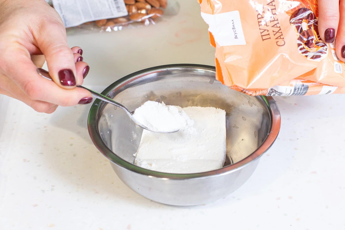 Творог смешайте с сахарной пудрой, добавьте крупно порубленный миндаль и перемешайте.