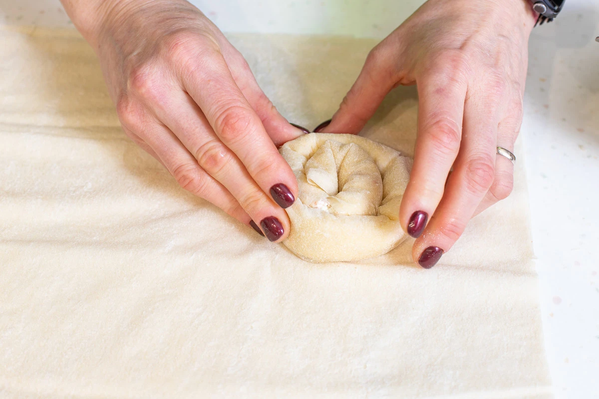 А затем скрутите улиткой. Повторите с остальным тестом и начинкой.