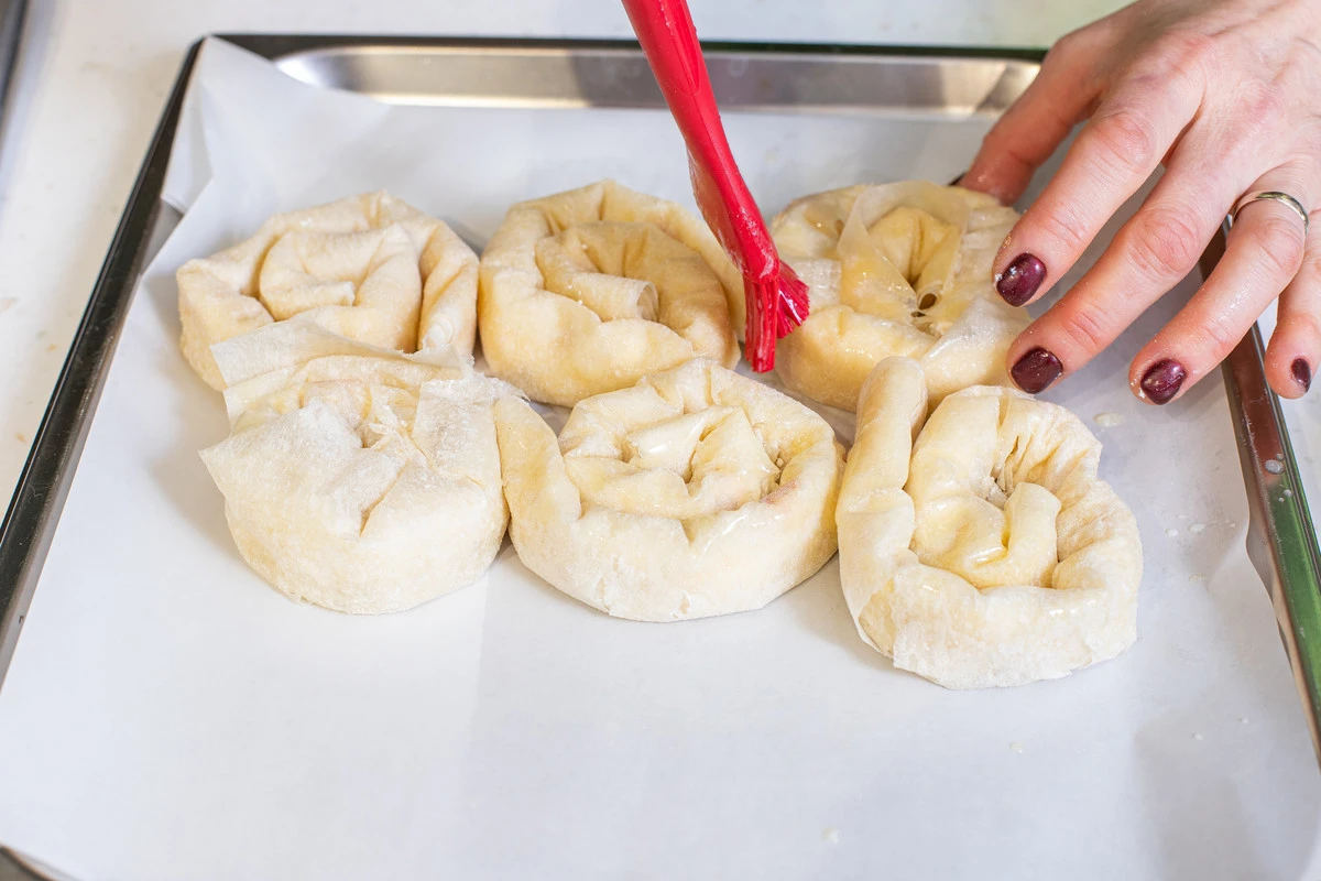 Выложите улитки на противень, застеленный пергаментом для выпечки, смажьте сахарным сиропом или сливочным маслом.