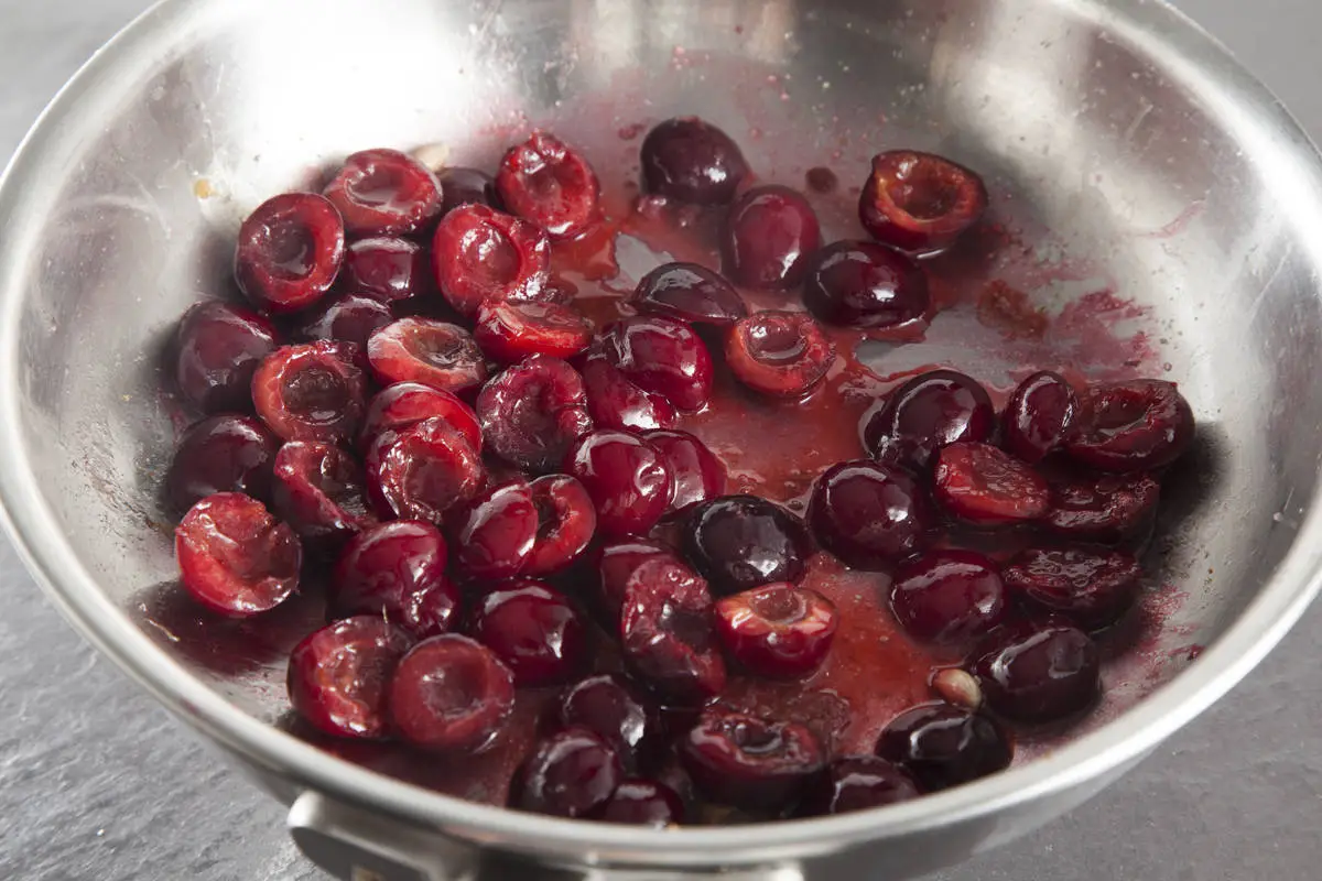 Черешню очистите от косточек, нарежьте половинками. В сковороде растопите сливочное масло с сахаром, слегка обжарьте черешню, влейте немного лимонного сока, посолите и поперчите, готовьте еще минуту, затем снимите с огня.