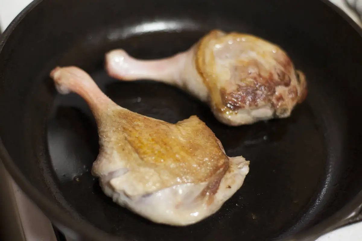 Утиные окорочка натрите солью и перцем, обжарьте на сковороде до золотистой корочки (очень хорош утиный жир для жарки, если его нет, возьмите немного топленого масла, а вот растительное — не советуем), выложите обжаренные окорочка на тарелку.