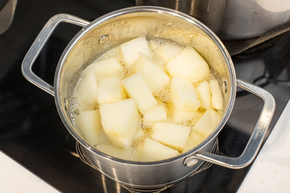 Положите дыню в кастрюлю с сахарным сиропом и готовьте 5 минут. Готовое варенье остудите и храните в холодильнике в банке до 1 месяца. Если варить его в 3 приёма, каждый раз доводя до кипения, проваривая 5 минут и остужая, то в конце такое варенье из дыни можно закатать в банки и хранить в тёмном прохладном месте. Однако тогда сахар стоит взять в пропорции 1:1 с дыней.