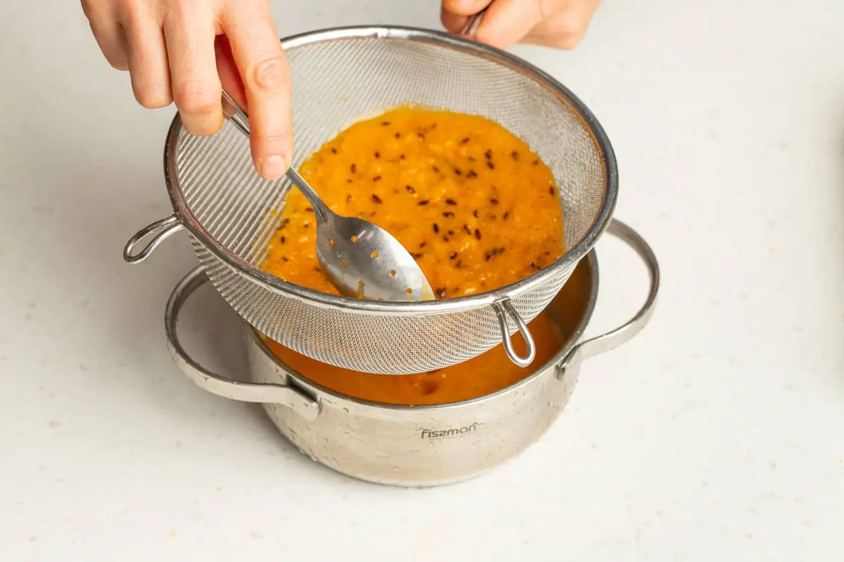 Получившееся облепиховое пюре протрите через сито, чтобы удалить косточки и остатки шкурок.