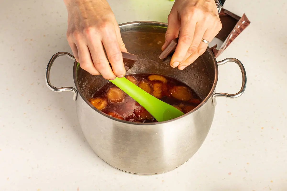 Добавьте шоколад, поломанный на кусочки, и снова доведите до кипения.