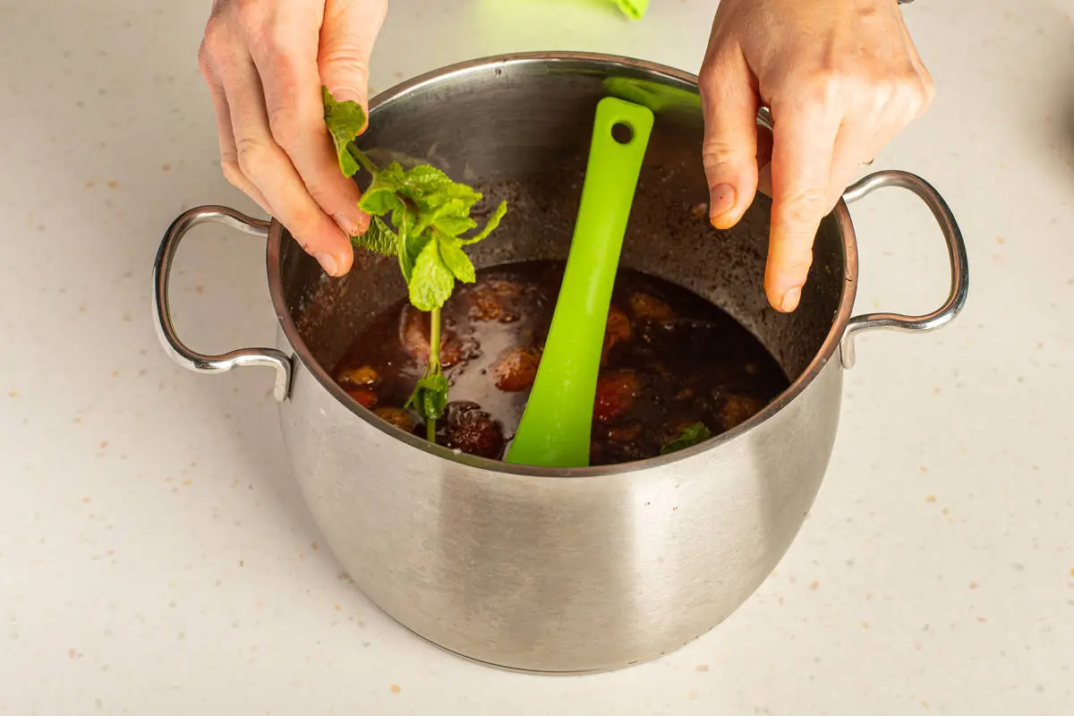 Положите свежую мяту стеблями вверх, чтобы её легко можно было удалить из кастрюли. Варите ещё 15 минут, помешивая.