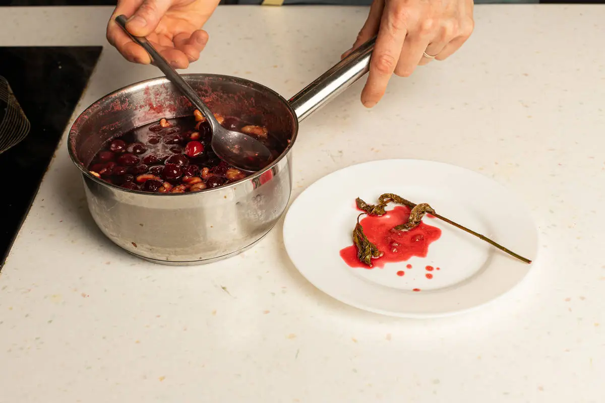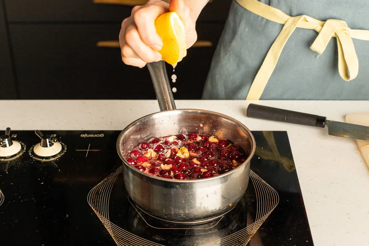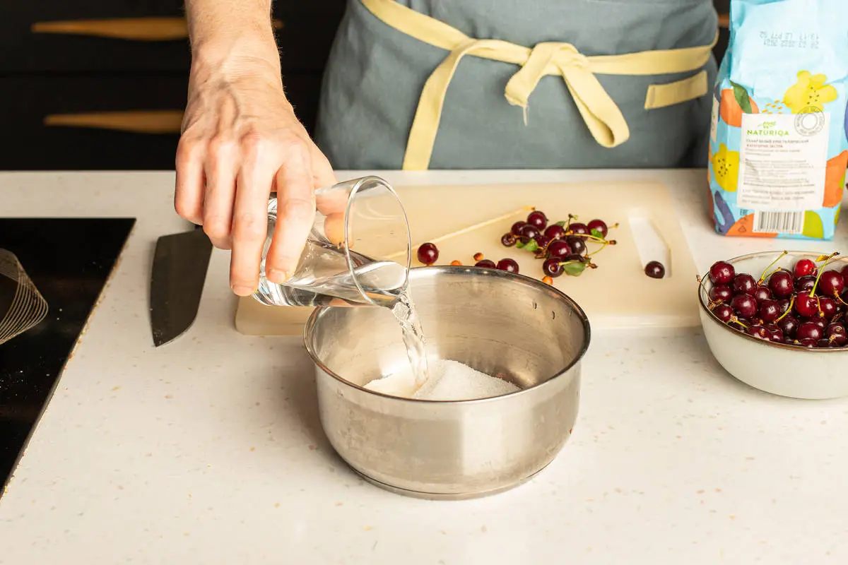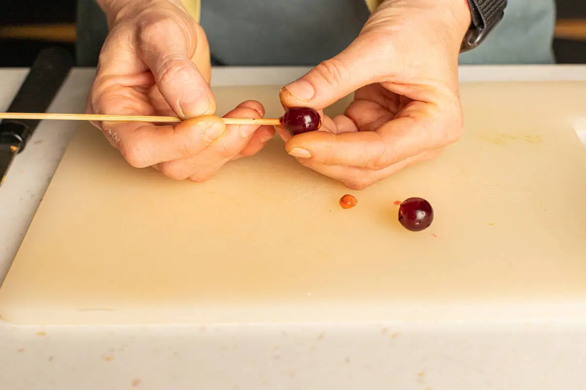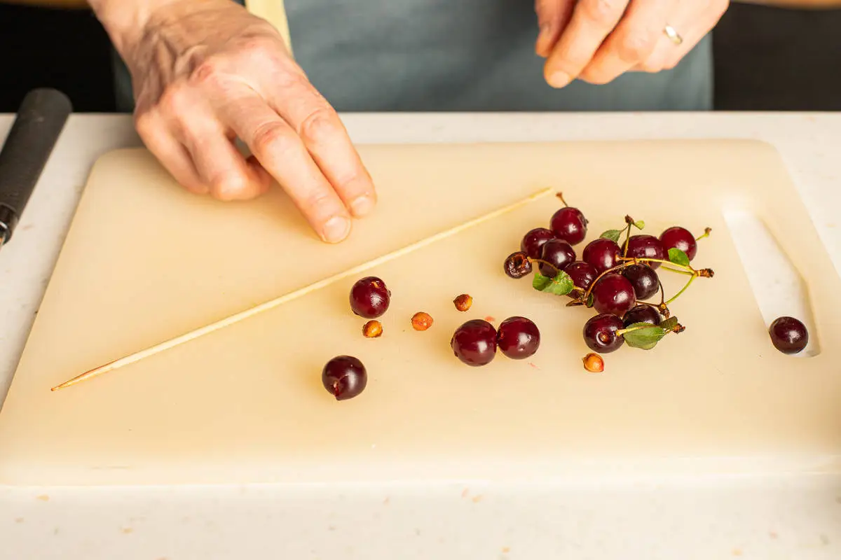 Самое сложное — удалить косточки из вишни: это можно сделать специальным инструментом или использовать обычную шпажку, просто проколите ею ягоду и выдавите косточку.