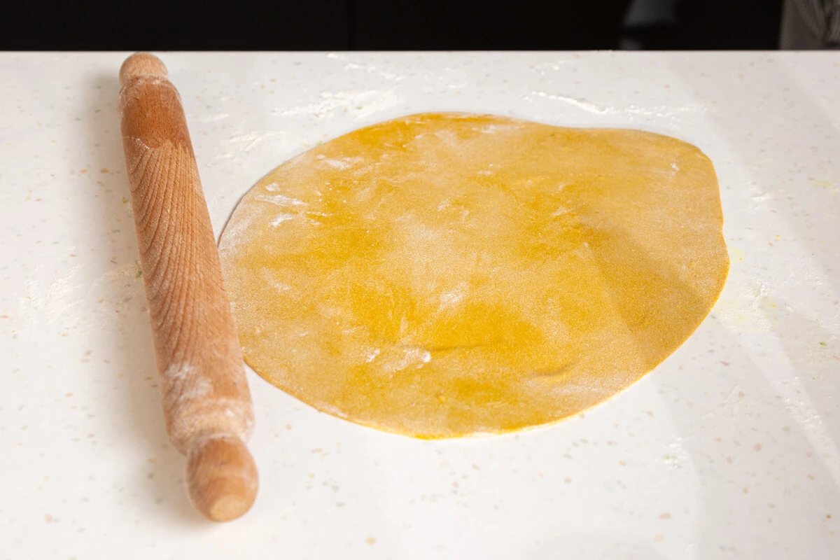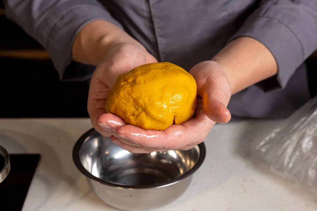 Для теста смешайте муку, куркуму, соль и желтки руками или с помощью миксера.