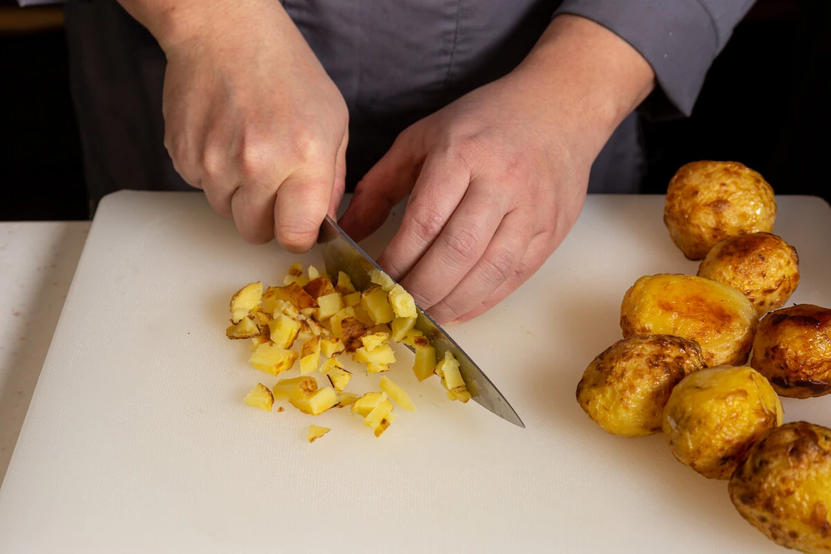 Картошку помойте, почистите и запеките до готовности в духовке, разогретой до 180 °C. В зависимости от размера клубней на это уйдёт 40–45 минут. Остудите и мелко порубите или помните толкушкой.