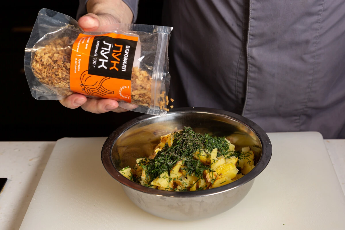 Укроп мелко порежьте и смешайте с картофелем. Добавьте лук фри и специи.
