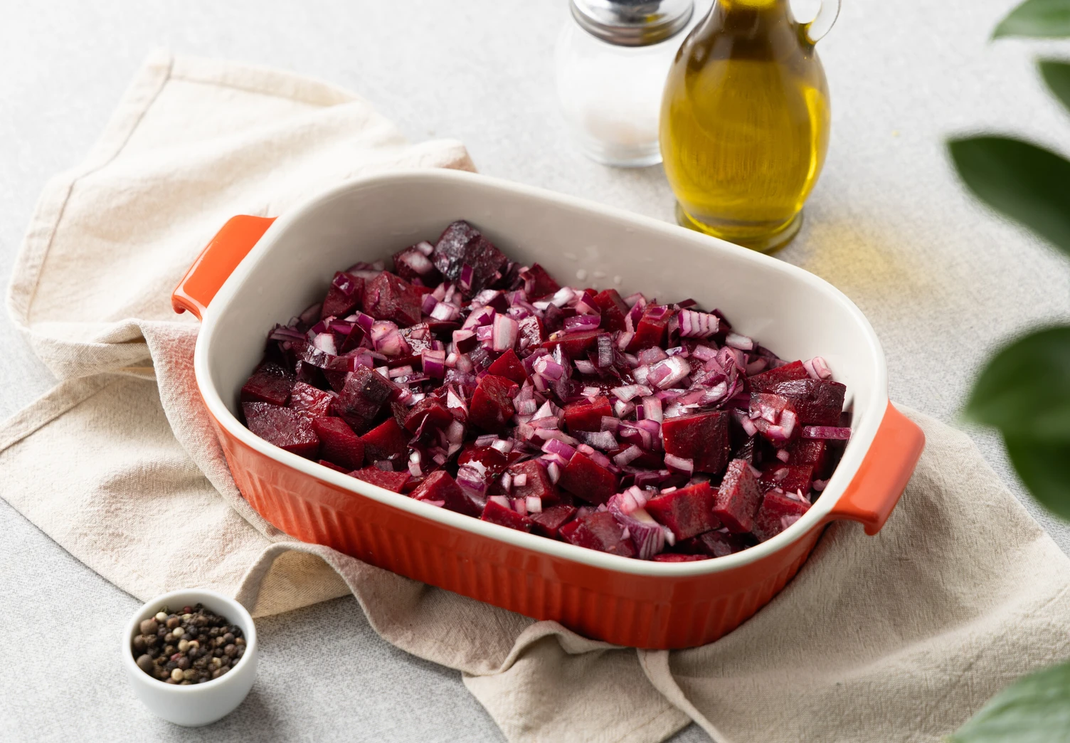 Свёклу хорошо помойте, почистите, нарежьте кубиками размером примерно 2 х 2 см. Красный лук почистите и нарежьте кубиками. Смешайте свёклу с красным луком, посолите, поперчите по вкусу, добавьте оливковое масло и перемешайте. Выложите в форму для запекания и готовьте в предварительно разогретой до 180 °С духовке 30–40 минут или пока свёкла не будет легко, без усилий протыкаться ножом.