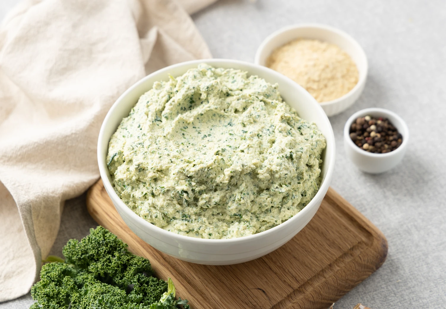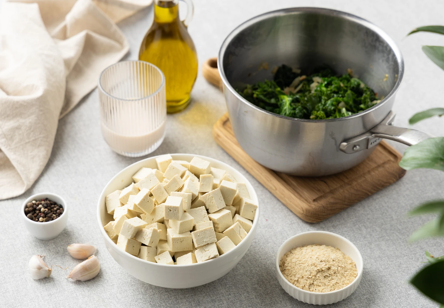 Переложите кейл с луком и чесноком в чашу кухонного комбайна или блендера. Тофу нарежьте кубиками. Добавьте их, пищевые дрожжи и миндальное молоко в блендер, посолите, поперчите и измельчите всё вместе до однородности.