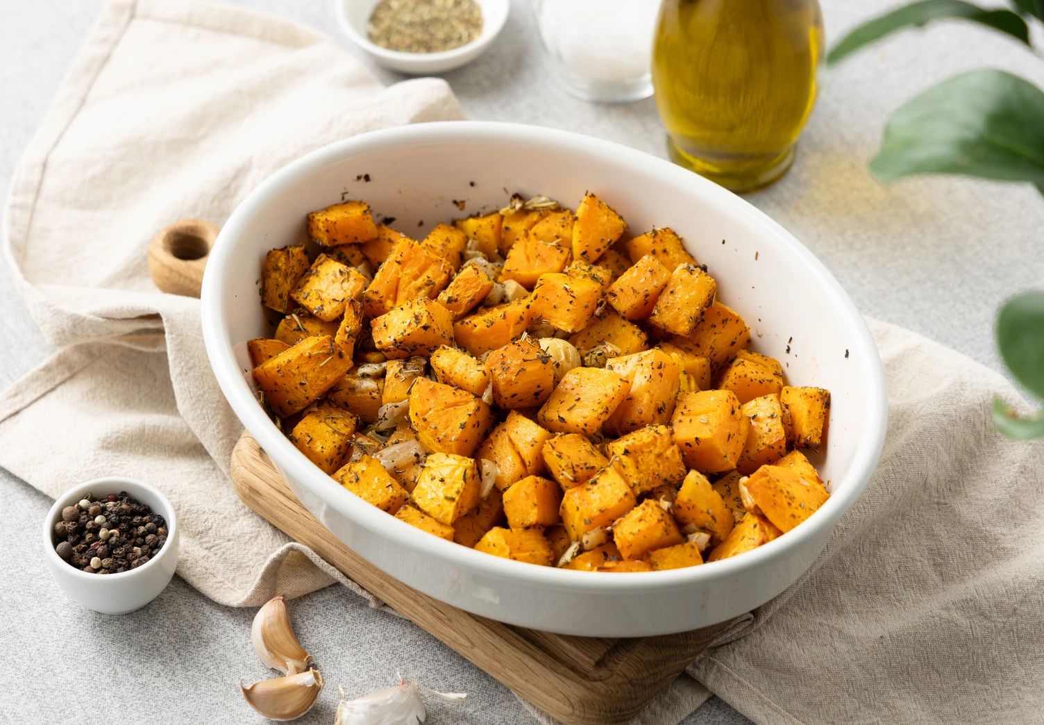 Тыкву помойте, почистите и нарежьте кубиками размером примерно 2 х 2 см. Чеснок почистите, нарезать не нужно. Лук почистите и нарежьте кубиками. Смешайте тыкву и лук, добавьте итальянские травы, соль, перец по вкусу, оливковое масло и перемешайте. Выложите получившуюся смесь в форму для запекания и готовьте в разогретой до 180 °С духовке 30–40 минут или до размягчения тыквы. Если у вас в духовку помещаются сразу 2 формы для запекания, вы можете приготовить одновременно свекольный и тыквенный слои.