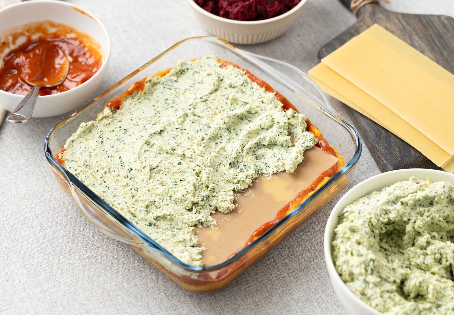 Соберите лазанью: на дно формы выложите примерно 1/3 соуса, сверху — 2 листа лазаньи. Далее в такой последовательности: тыквенный слой — 2 листа лазаньи — 1/3 томатного соуса — 2 листа лазаньи — слой из тофу с рикоттой — немного соуса бешамель — 2 листа лазаньи — свекольный слой — 2 листа лазаньи — оставшийся томатный соус — оставшийся соус бешамель. Мы использовали томатный соус с кусочками помидоров — по желанию вы можете измельчить его блендером или оставить так. Если у вас не квадратная форма, а прямоугольная, например размером 28 х 15 см, в этом случае можно выкладывать не по 2, а по 3 листа лазаньи на один слой.