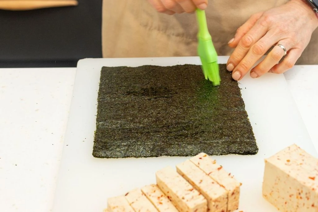Листы водорослей нори разрежьте пополам. Каждый лист слегка смочите водой с помощью кулинарной кисти.