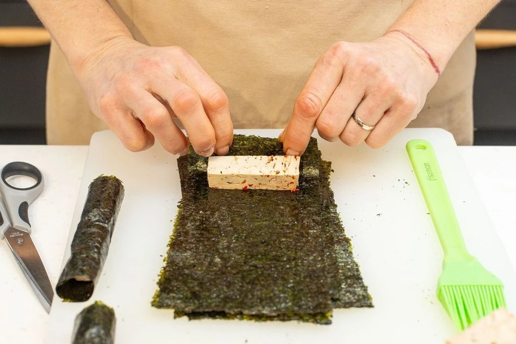 Обжаривайте, пока кляр не прихватится — примерно по 2 минуты с каждой стороны. Если у вас останутся листы нори, используйте их для сервировки: например, их можно положить на тарелку, а сверху выложить брусочки тофу в кляре. Подавайте, по желанию присыпав кунжутом, с соусом терияки, соевым или рыбным.