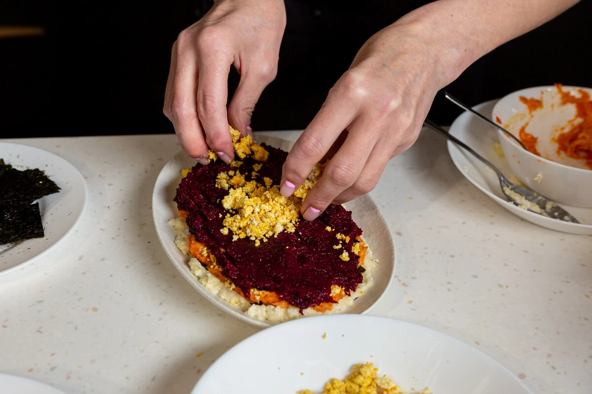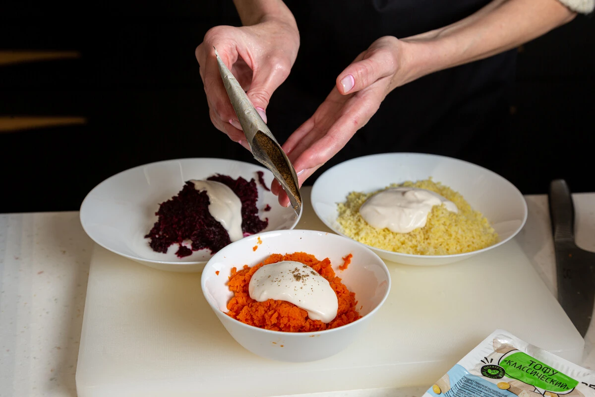 Выложите салат слоями: картофель, нори, лук, морковь, тофу, нори, свёкла, тофу. Часть сыра для верхнего слоя по желанию смешайте с куркумой — будет похоже на варёные желтки.