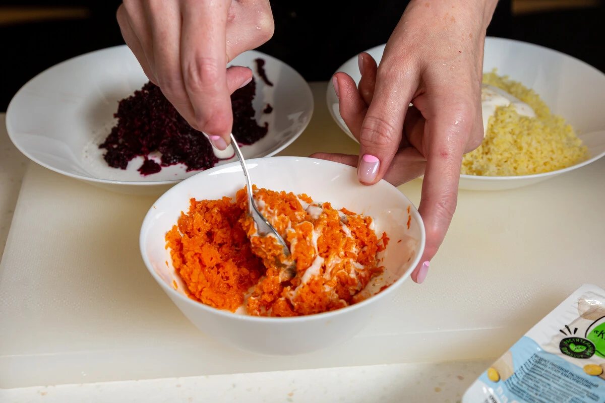 Распределите майонез равномерно между варёными овощами. Перемешайте.