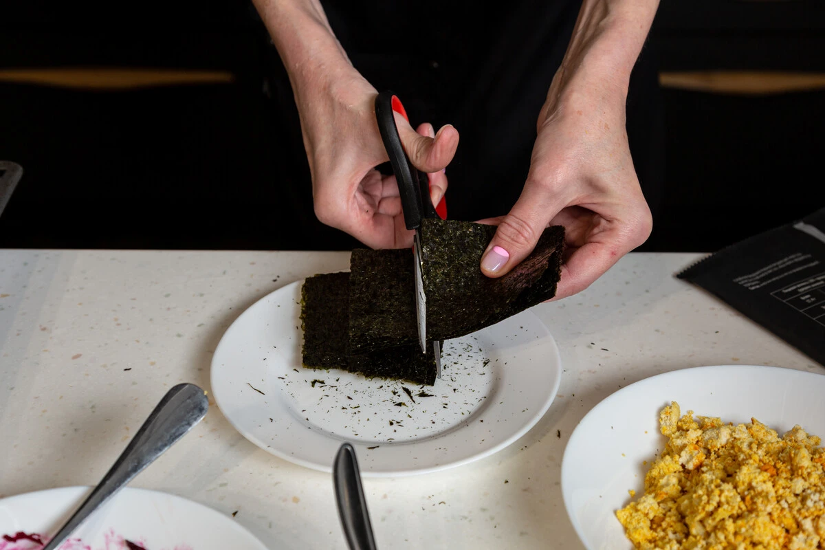 Приготовили веганскую версию всеми любимого новогоднего салата: вместо селёдки использовали водоросли нори, а яйца заменили на тофу с куркумой.