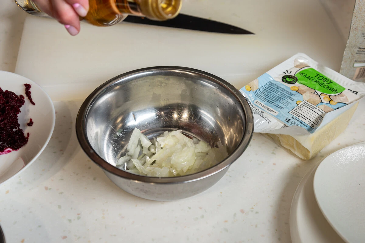 Репчатый лук нарежьте мелким кубиком и замаринуйте в смеси уксуса и растительного масла.