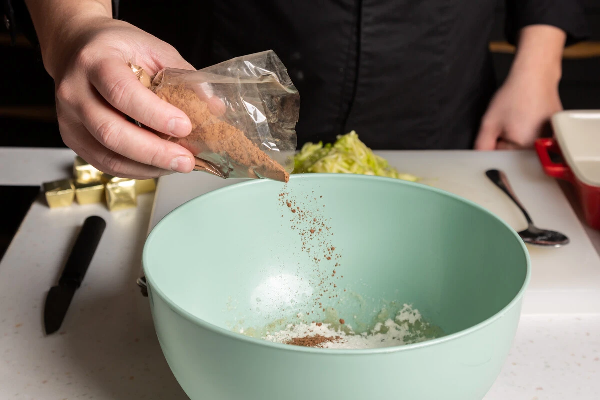 Добавьте муку, какао, соду и соль. Перемешайте до однородной массы.