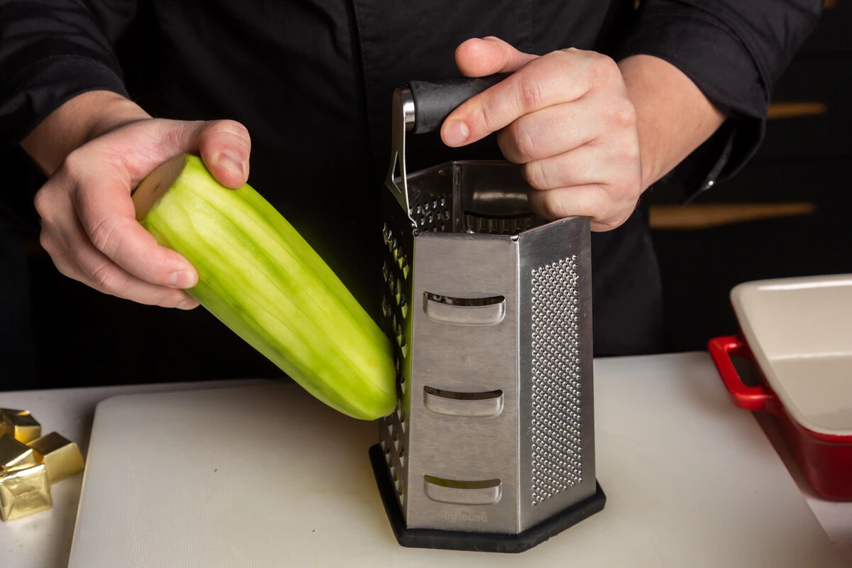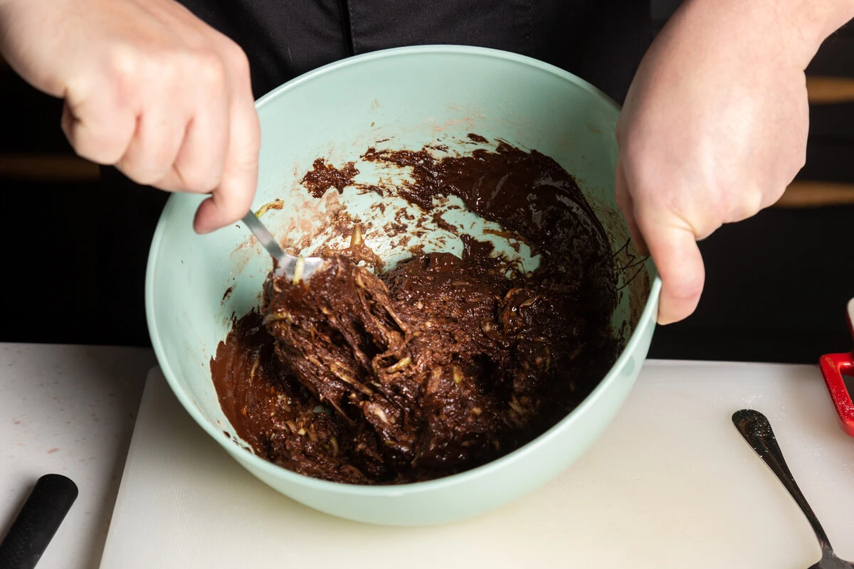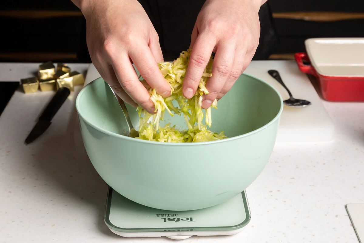 Вмешайте кабачки в тесто, дайте ему постоять 5 минут и ещё раз хорошо перемешайте.