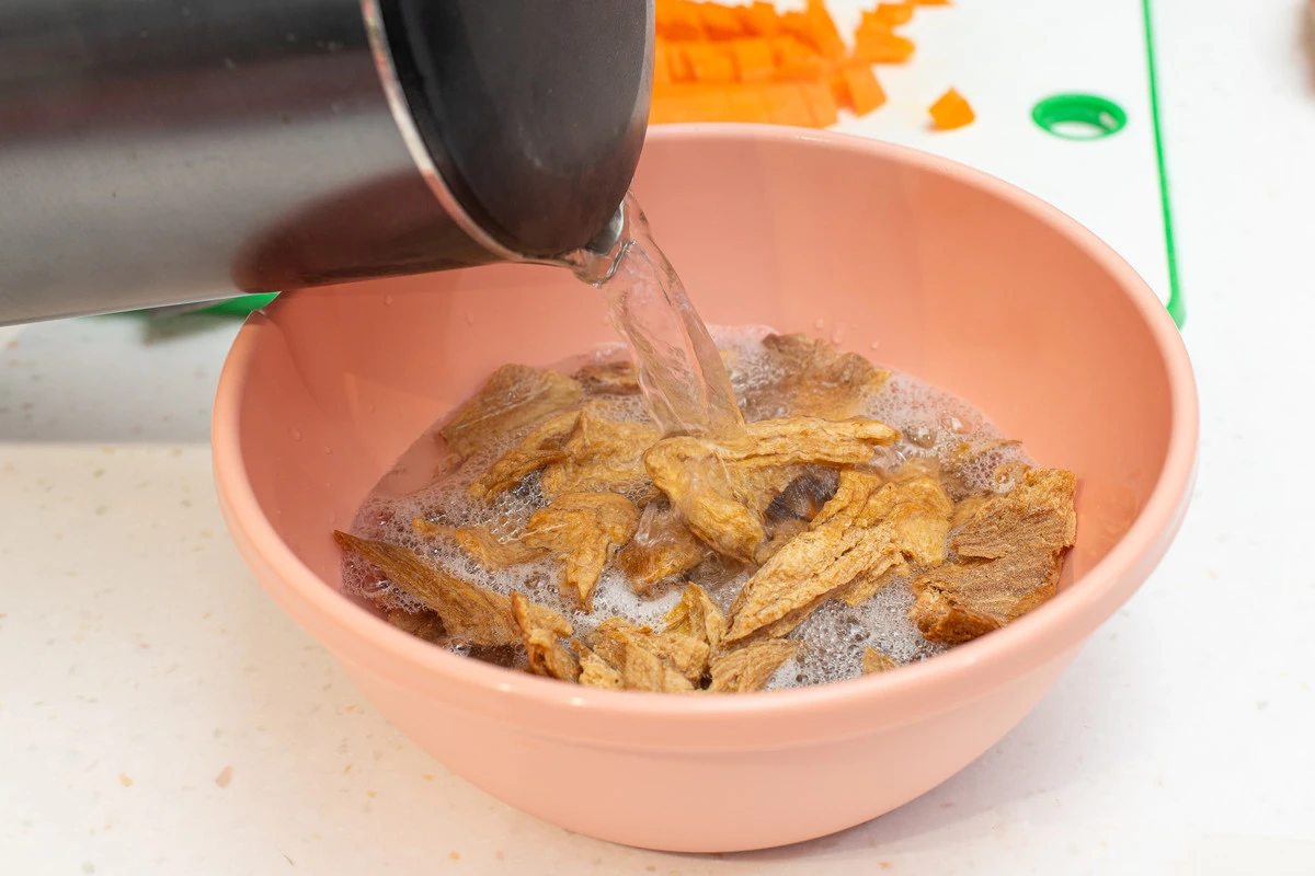 Залейте растительный белок кипятком примерно на 15 минут, чтобы он разбух.