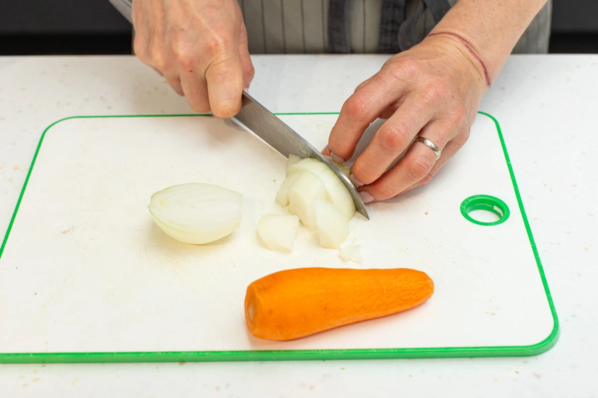 Помойте и почистите морковь, лук и чеснок. Крупно нарежьте.
