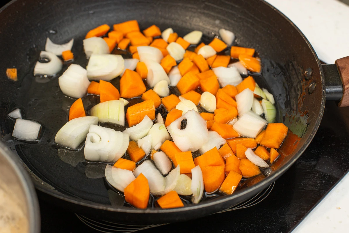 Разогрейте сковороду с оливковым маслом, выложите в неё морковь, лук и чеснок и жарьте, периодически помешивая, на среднем огне 5-7 минут.
