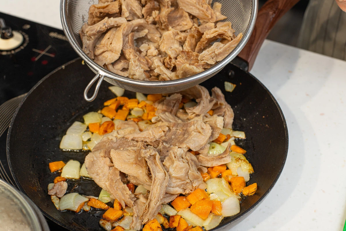 Откиньте разбухший растительный белок на дуршлаг, отожмите руками или оставьте, чтобы стекла жидкость. Выложите в сковороду с луком и морковью. Прогрейте всё вместе на среднем огне 5-7 минут, не забывая помешивать. Дайте немного остыть.