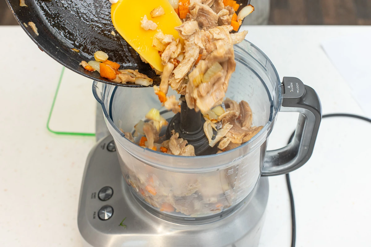 Выложите белок с овощами в чашу комбайна или блендера и измельчите до однородности. Не используйте для измельчения горячих ингредиентов вакуумный блендер! Лучше обычный блендер или комбайн — это безопаснее.