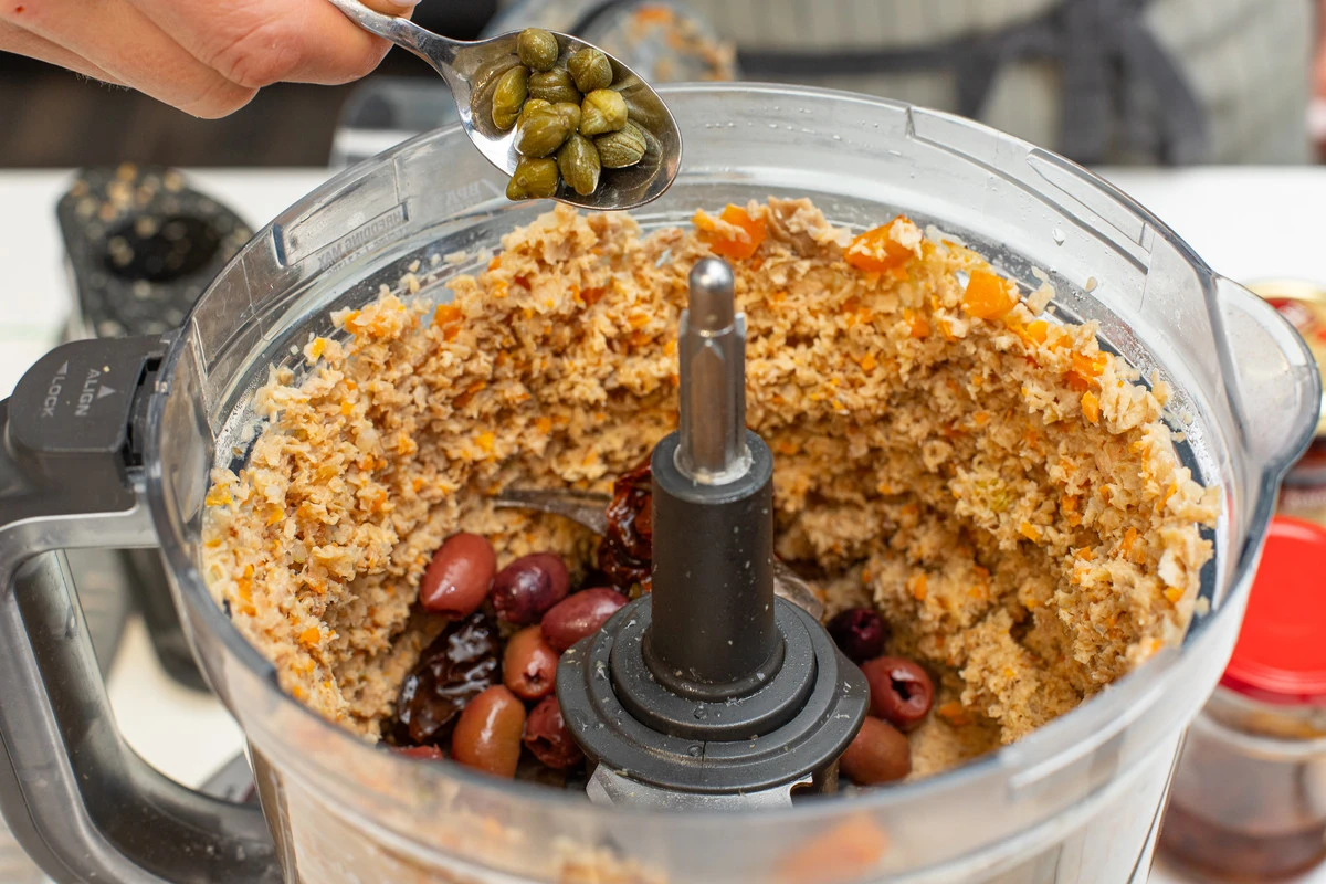 Добавьте в чашу комбайна или блендера вяленые томаты, оливки, каперсы и снова пробейте до однородности. В этот паштет вы также можете добавить щепотку паприки, мускатного ореха, чёрного перца.