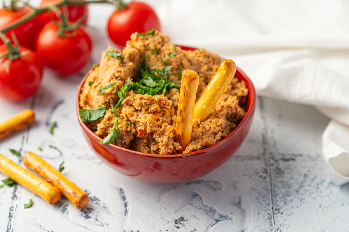 Эта вкусная закуска подойдёт как тем, кто придерживается растительного питания, так и тем, кто хочет разнообразить своё меню. Подавайте веганский паштет с хлебными палочками или же крекерами, хлебцами или хрустящими тостами.