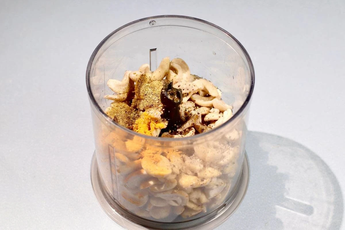 Слейте воду, переложите орехи в чашу блендера и добавьте специи. Влейте столовую ложку воды.