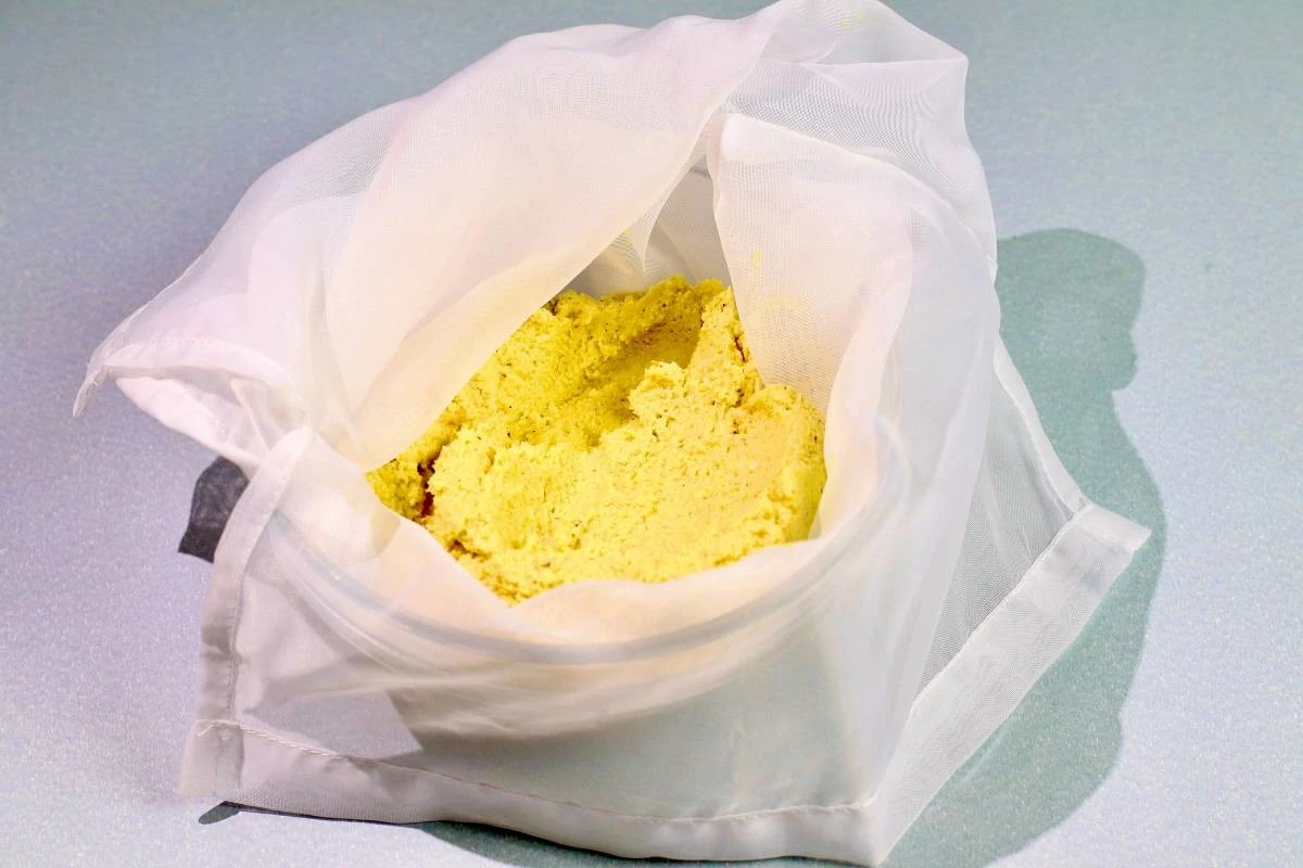 Переложите смесь в марлю, перетяните лентой или нитью. Сверху добавьте тяжёлый пресс. Уберите в холодильник на ночь.