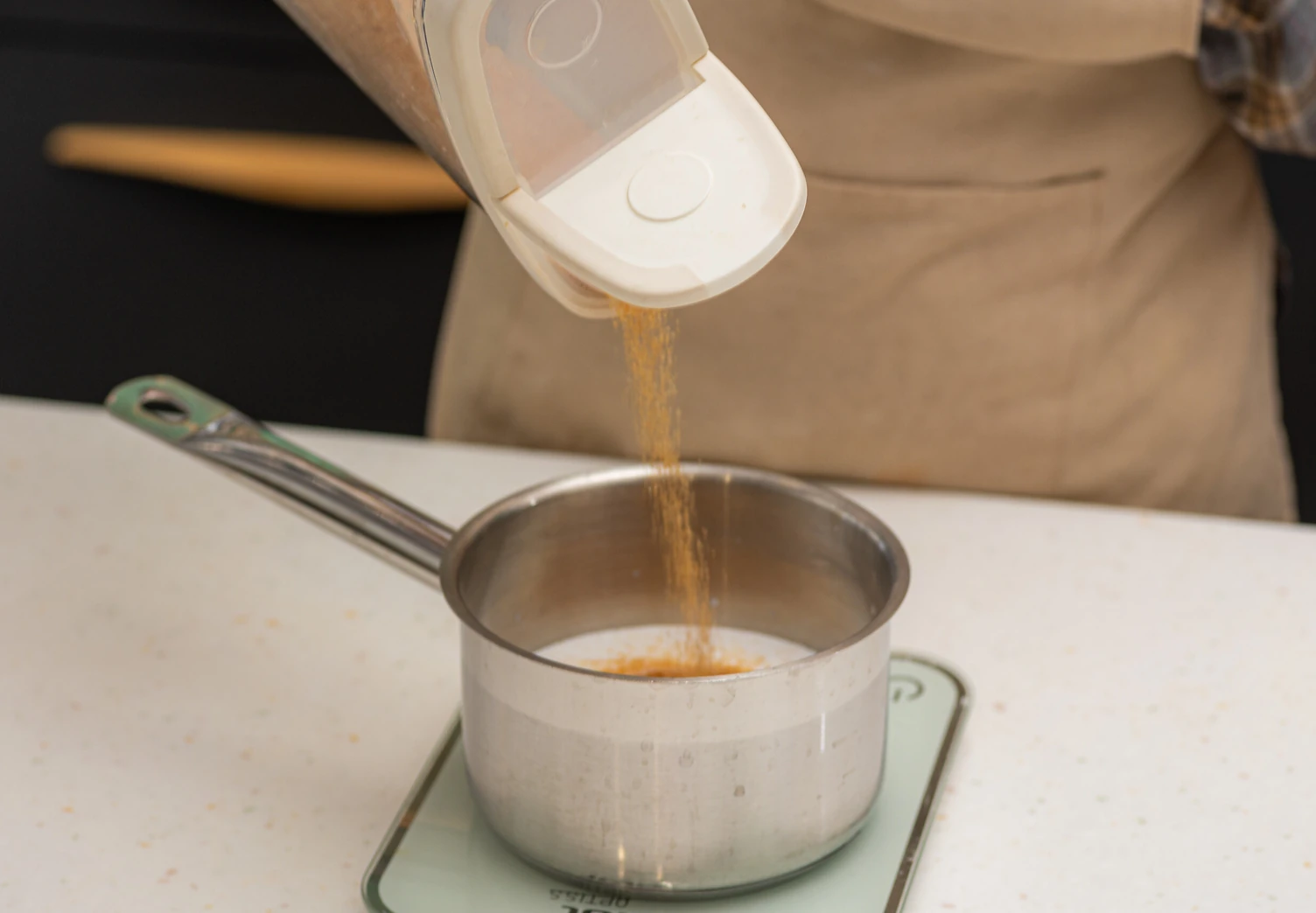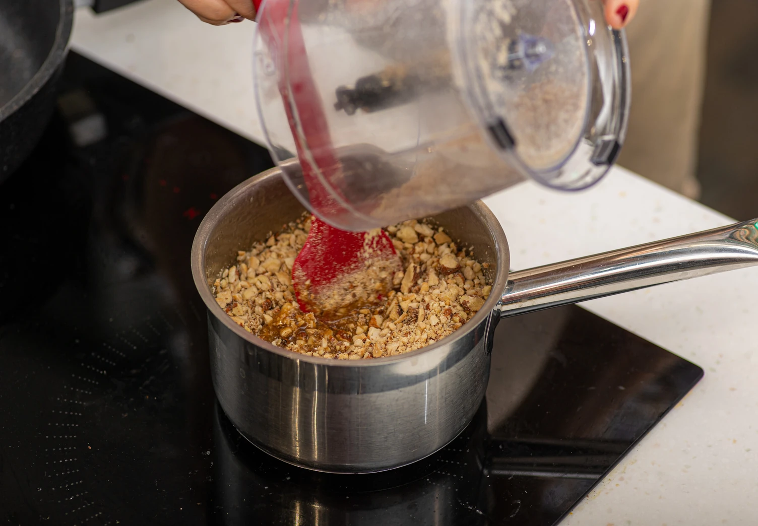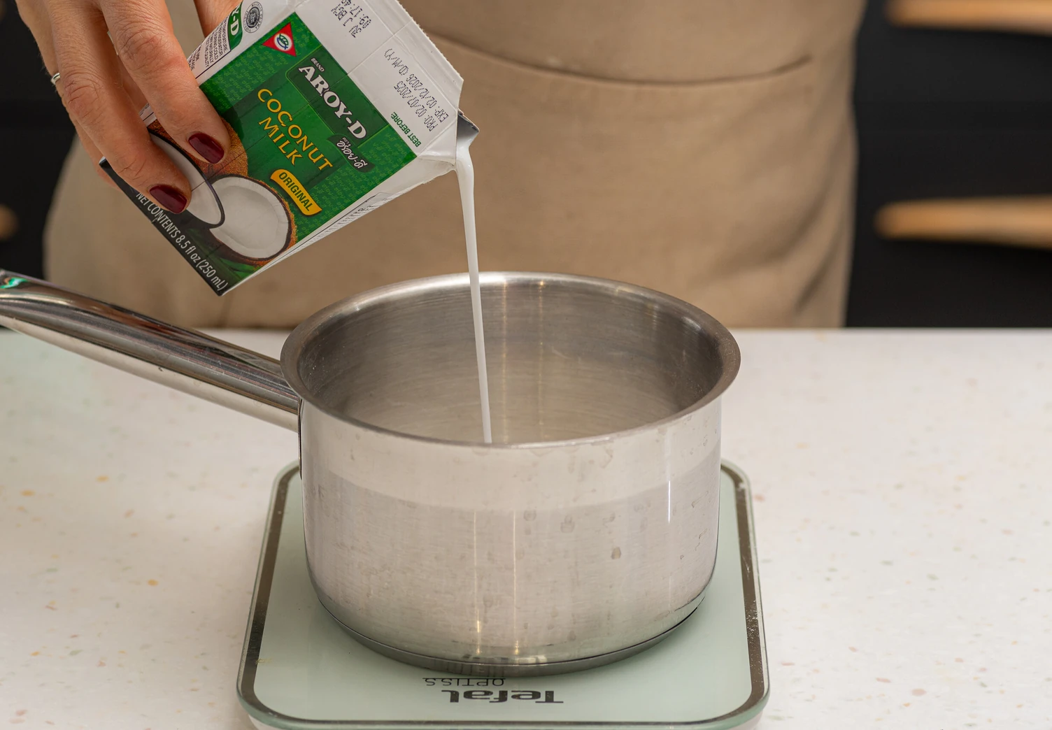Пока готовится основа тарта, поставьте сотейник на средний огонь. Влейте кокосовые сливки и нагревайте до тех пор, пока консистенция не станет очень жидкой.