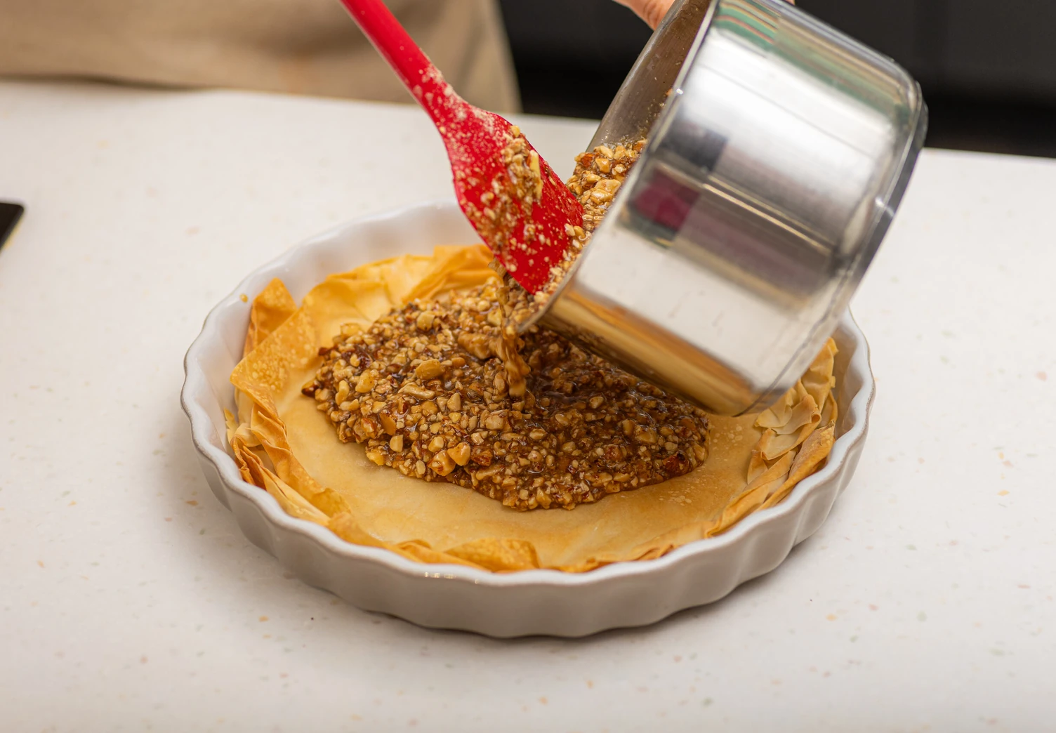Вылейте карамельно-ореховый соус на основу тарта и распределите начинку до краёв. Разровняйте поверхность. Уберите тарт в холодильник на 30–40 минут.