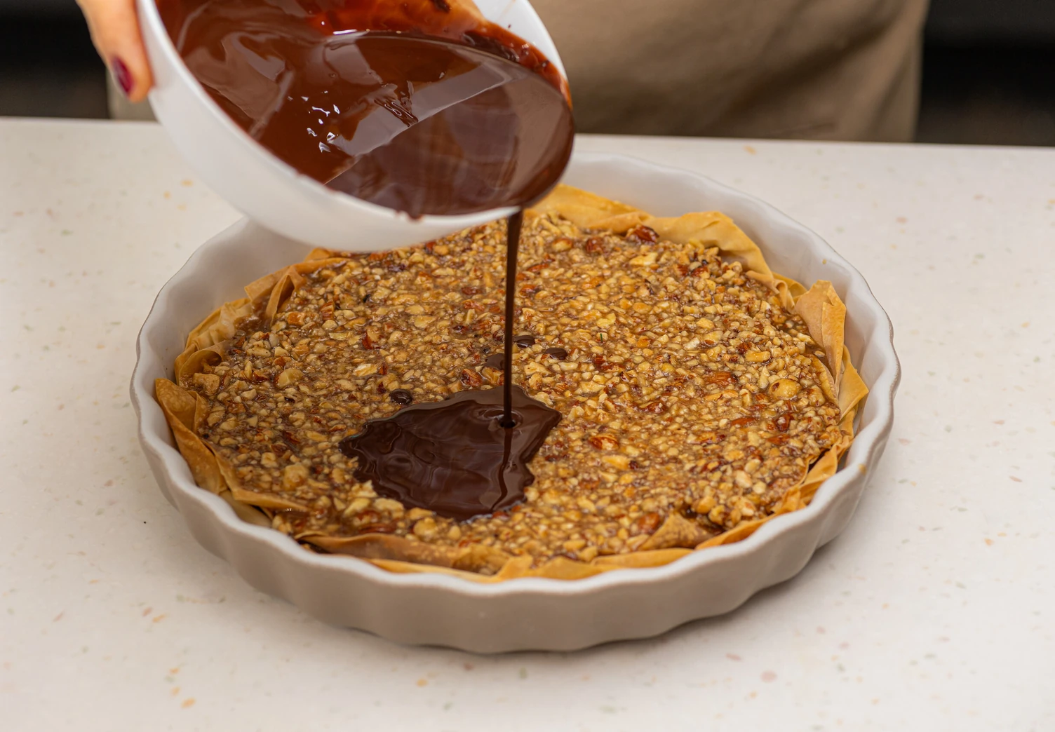 Этот тарт доказывает, что и веганский десерт может быть по-настоящему вкусным. Внутри него то, что нужно сладкоежкам для счастья: хрустящая основа, тягучая карамель, насыщенный шоколад. И всё это — полностью на растительной основе.