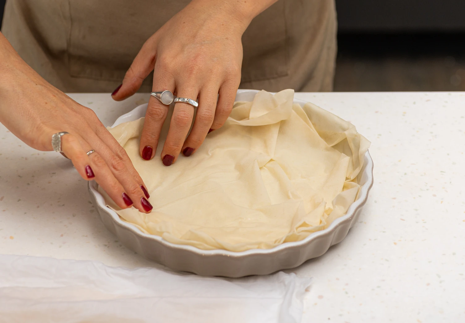 Положите первый лист теста в форму так, чтобы его края свисали, образуя бортики.