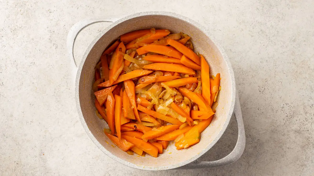 Лук нарежьте полукольцами, морковь — крупными брусочками. В казане или кастрюле с толстым дном обжарьте лук и морковь на растительном масле до размягчения моркови (около 10 минут).
