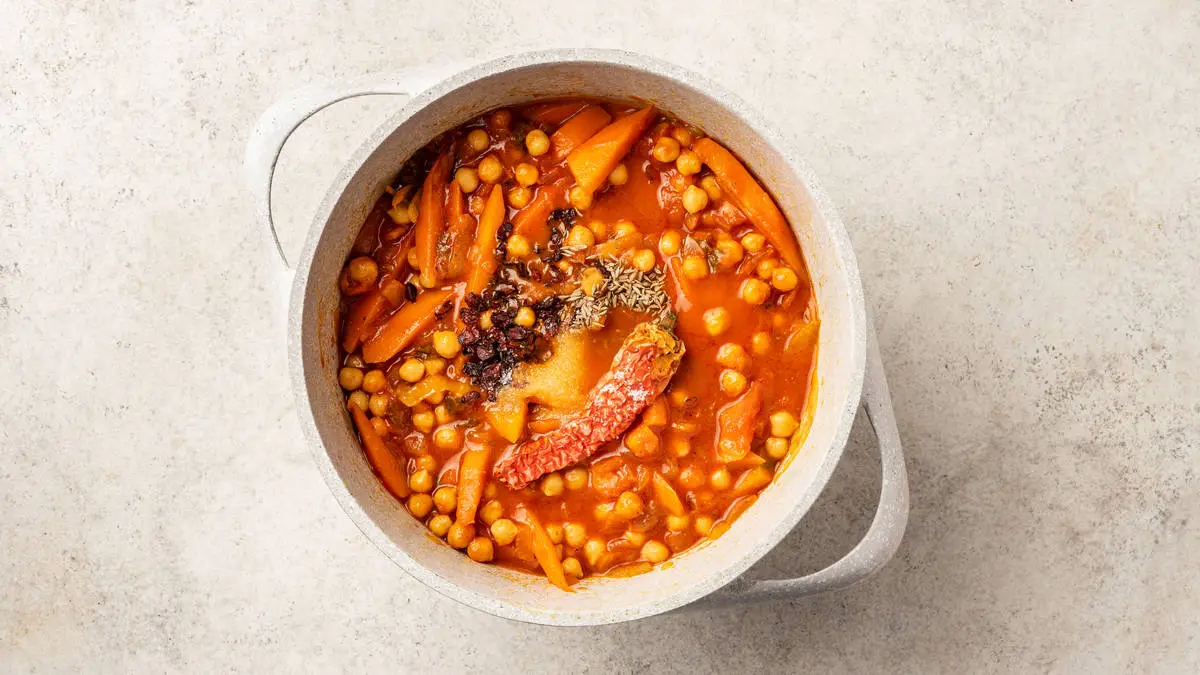 Добавьте нут в пряном соусе, зиру, барбарис, острый перчик и соль, потушите ещё около 5-10 минут.