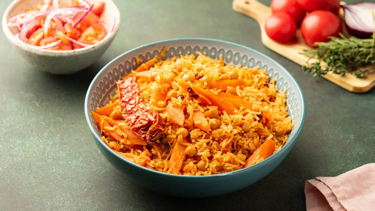 В вегетарианском плове мясо неплохо заменяет нут, выступая в роли белковой составляющей. И, конечно, не обойтись без традиционных для плова овощей — моркови и лука. А также ярких специй и чеснока.