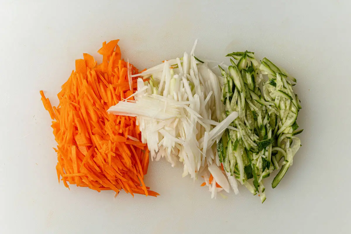 Дайкон и морковь очистите и измельчите на тёрке для корейской моркови. Если такой тёрки нет, можно использовать обычную или нарезать тонкими брусочками при помощи острого ножа. Огурец также измельчите на тёрке.