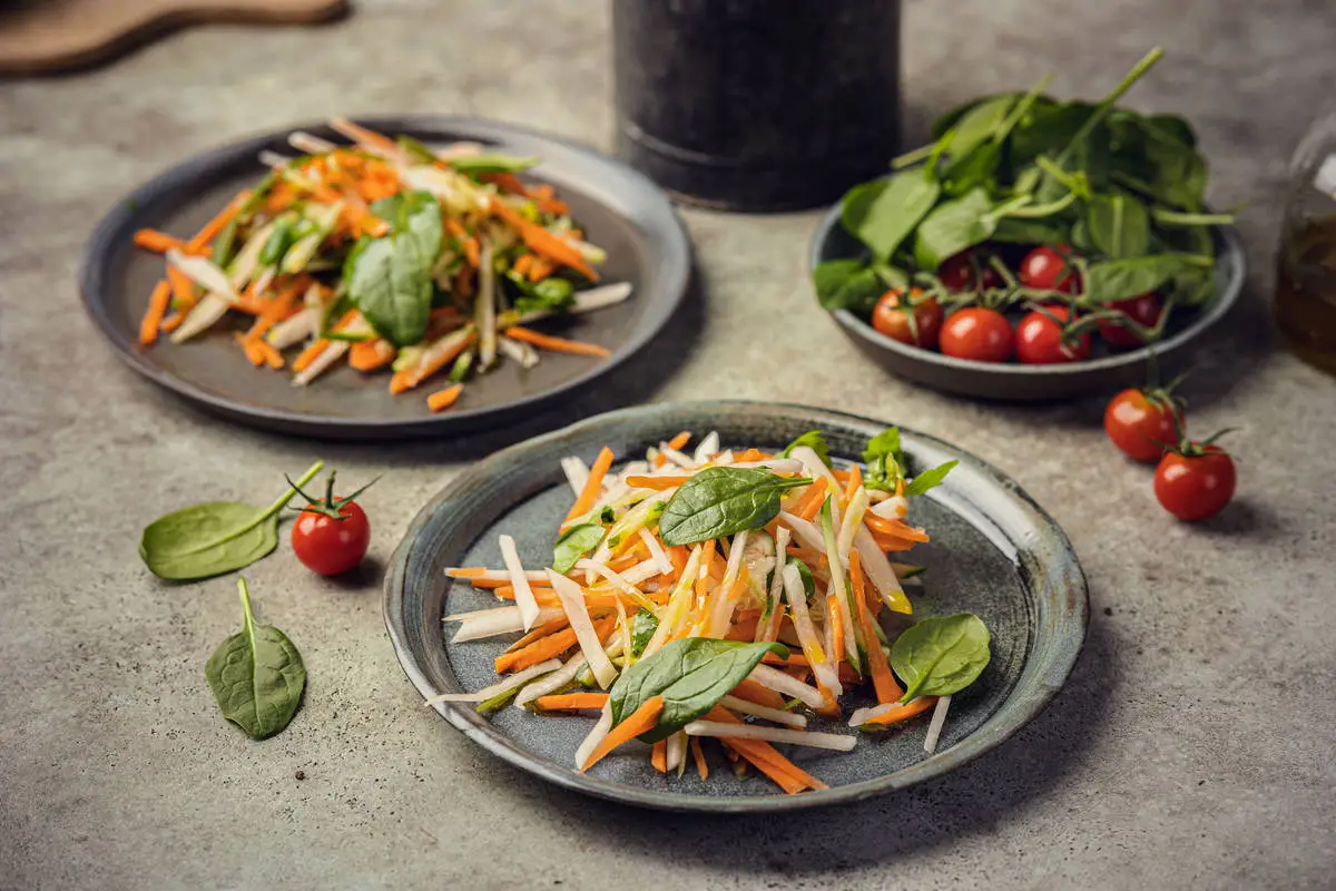 Смешайте овощи со шпинатом, рубленой петрушкой, посолите и заправьте горчичным маслом.