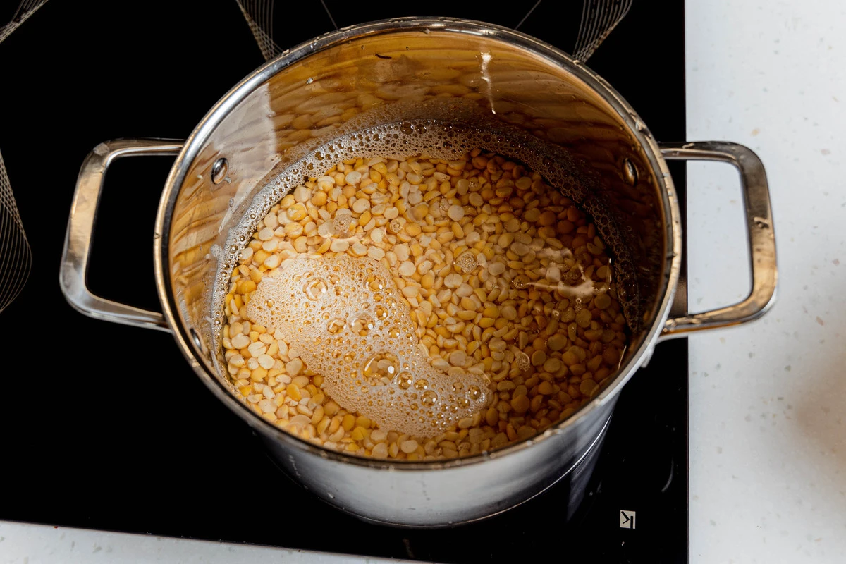 Положите горох в кастрюлю, добавьте стакан воды, но не солите.