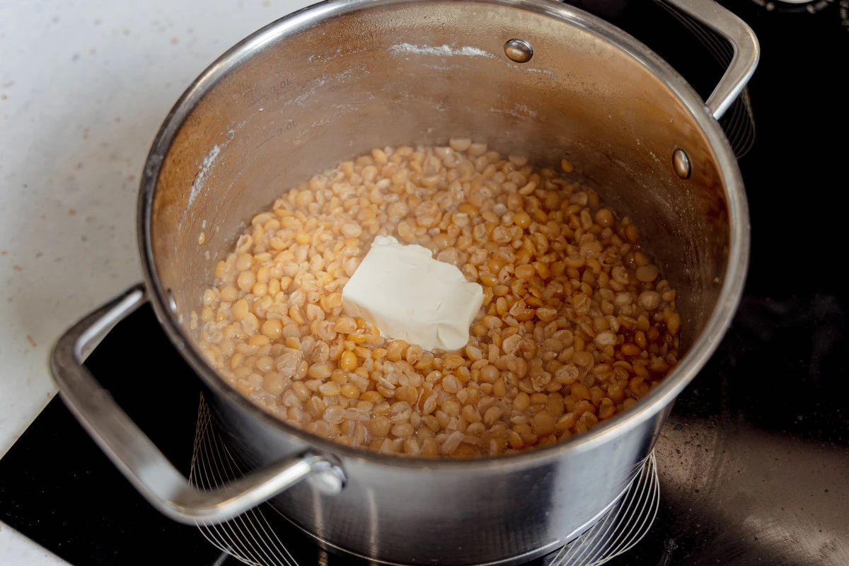 Когда вода впитается, а горох станет мягким, добавьте сливочное масло и соль.
