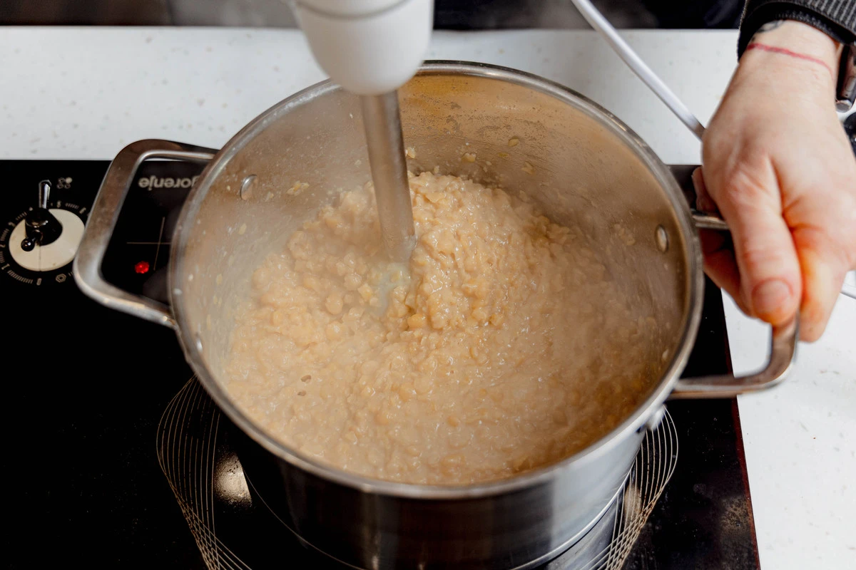 Превратите всё в пюре с помощью толкушки или погружного блендера. Можно растереть горох в гладкое пюре или оставить более грубую структуру.