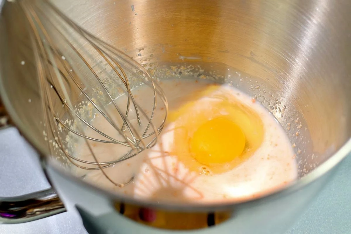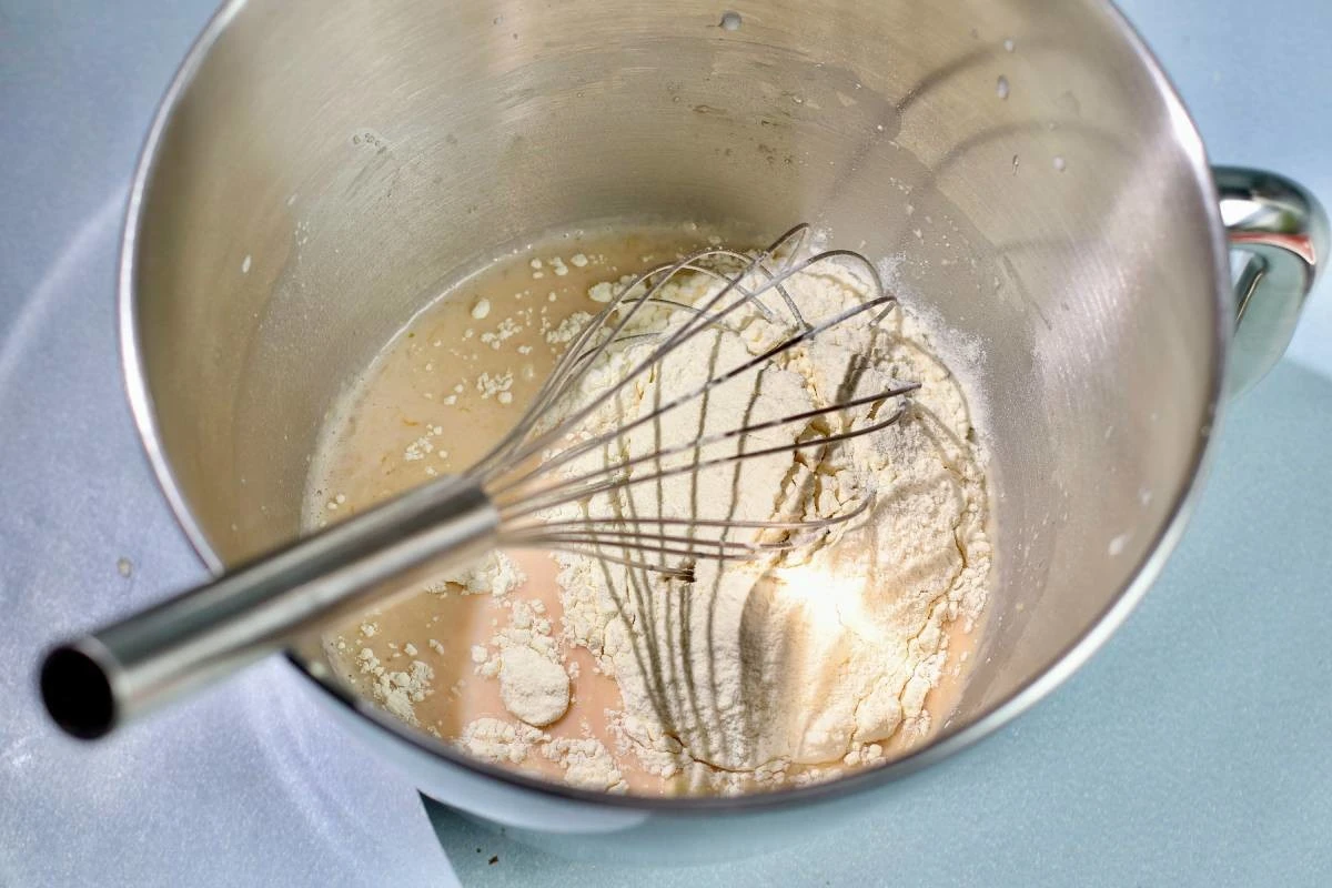 Смешайте теплое молоко, воду, дрожжи, сахар, соль и яйцо.