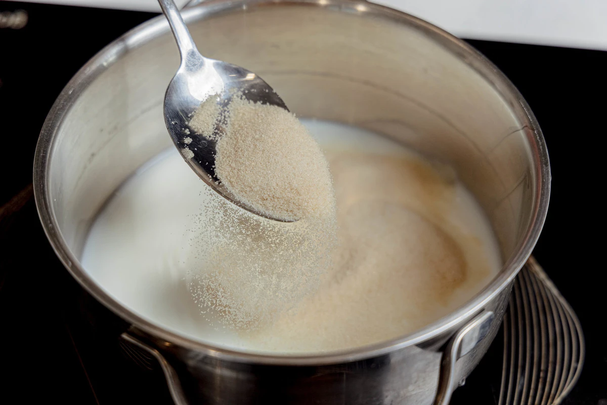 Желатин залейте молоком на 10 минут, затем поставьте на огонь и нагревайте, постоянно помешивая, до растворения желатина. Не доводите до кипения.