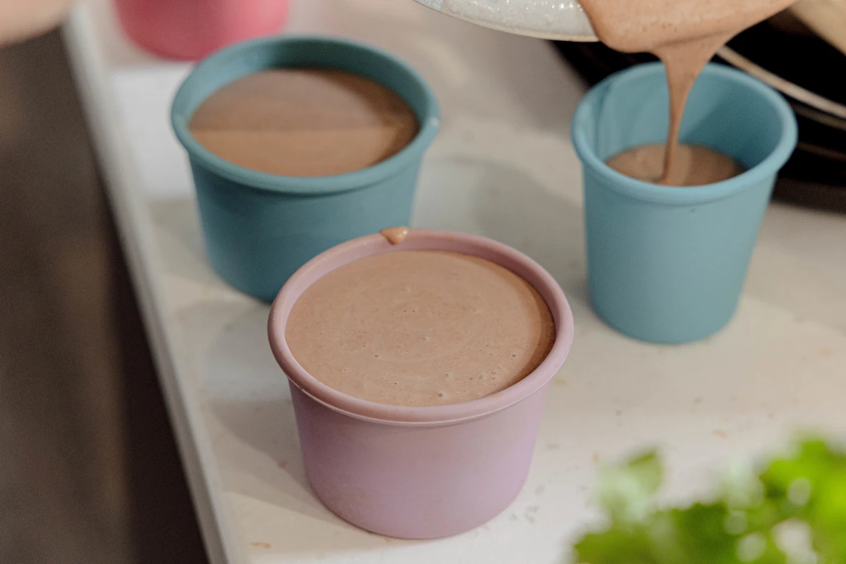Выложите шоколадный слой поверх схватившегося белого и уберите формочки в холодильник на 3-4 часа до застывания.