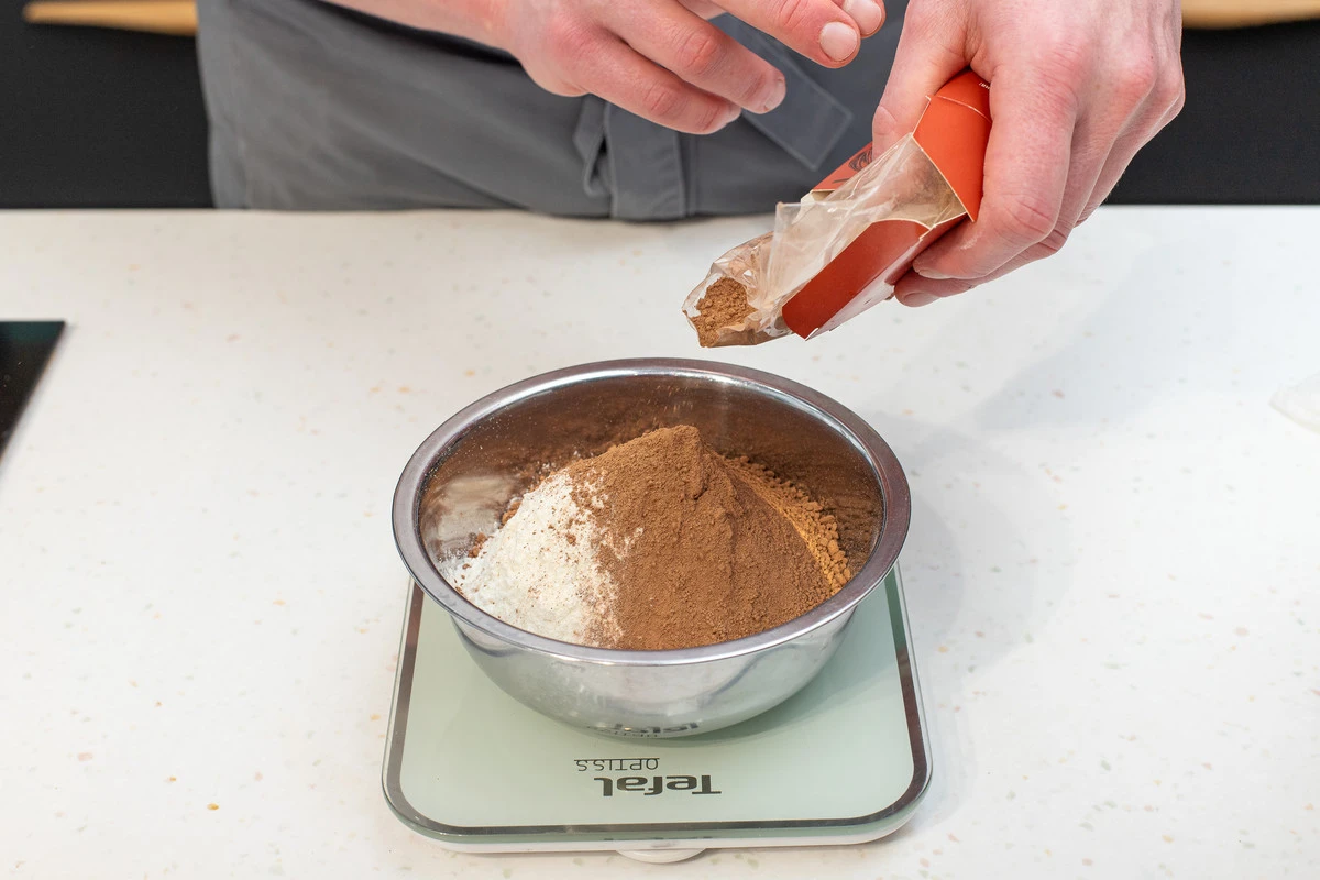 Смешать сухие ингредиенты: муку, какао, соду, соль.